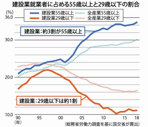 建設業に従事する技能労働者のうち29歳以下の若年層の数が昨年36.5万人となり、